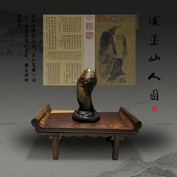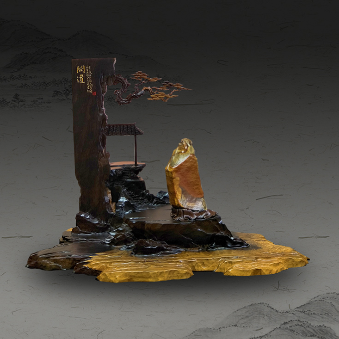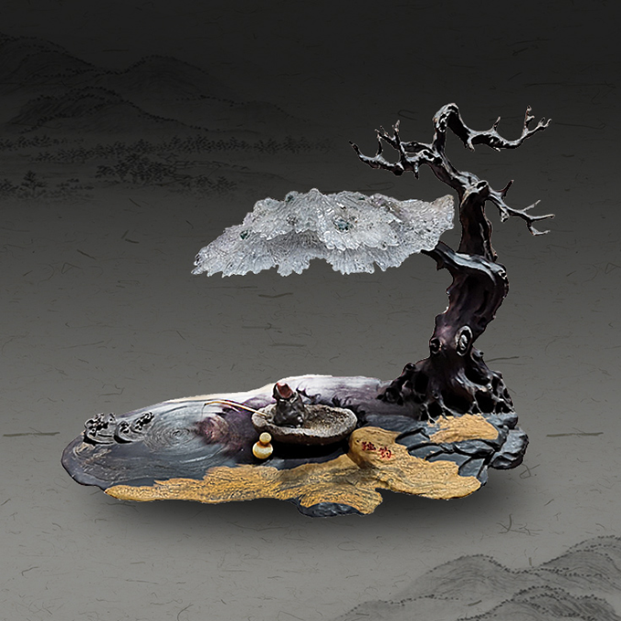 第二类是通过精雕创意木座补缺及塑造场景的故事作品,不但精准的烘托了奇石主体,更完整的体现了故事情节寓意,使整件艺术品蜕变升华。让人流连忘返!