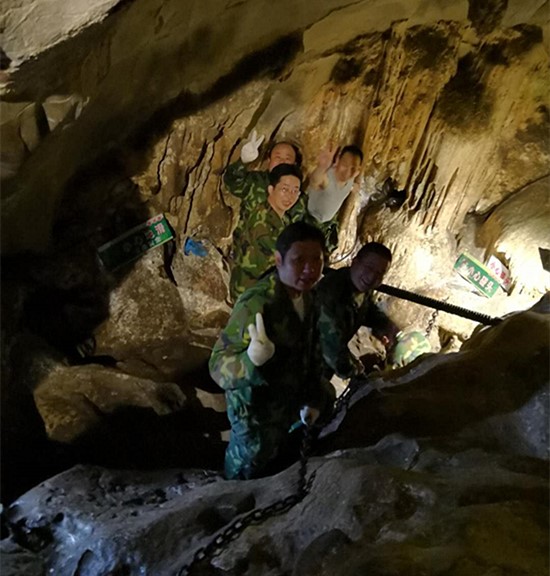 饭后,来不及休息,六支队伍在教练在带领下直奔当地著名的景点王莽洞。进洞前,大伙儿并未曾想到,即将面临一场异常艰苦的挑战。毕竟玩过那么多溶洞,无非都是欣赏各种鬼斧神工的天然钟乳石。但一踏入洞口,小欧首先就被那黑幽幽、深不见底的洞下天地给震住了,想领略洞中风景,必须先通过一道垂直狭窄的梯子下洞,秀气的妹子们克服心中恐惧,奋力攀爬,终于顺利下到洞中。