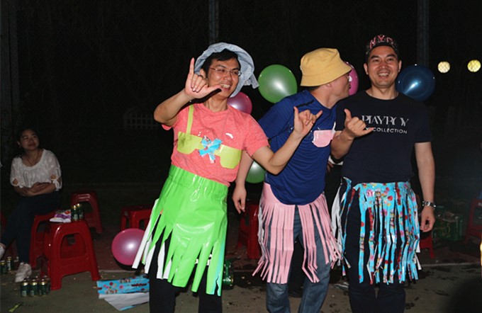 “今天你们设计成什么样,我就穿什么样!”在副总裁赵红平的表率下,胡勇和张杰两位总裁助理也都豁出去了。可是万万没想到的是,女队友们竟然给他们每人设计了一套性感无比的比基尼草裙!还有维蜜小天使的气球翅膀!在此,请颁给2队设计师一个最佳勇气奖!